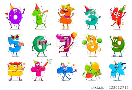 Birthday holiday celebration, cartoon math numbers and digits characters enjoy a lively festive event with confetti and party hats. Vector numeral personages for fun, learning, and children education