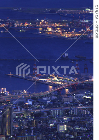 日本 兵庫県神戸市の六甲山天覧台から見えるマジックアワー時の神戸の街並みと大阪湾