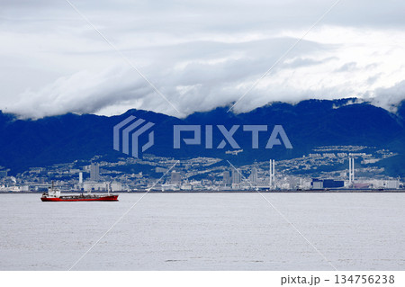 神戸市の海岸線ポートアイランド側から六甲山に抱かれる山手住宅街を望む都市風景