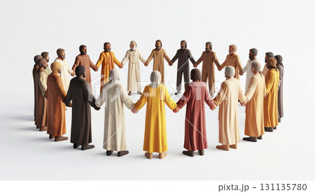 3D render of diverse colorful human figures holding hands in a circle, symbolizing unity, equality, teamwork, and community connection with minimal white background