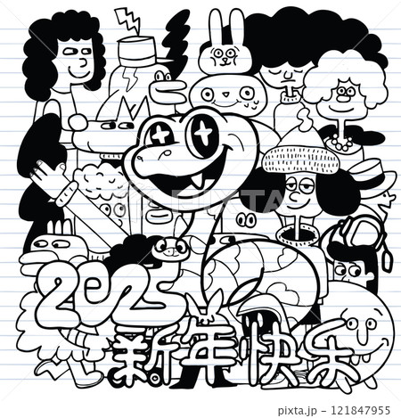 Colorful cartoon characters celebrating New Year 2025 with joy