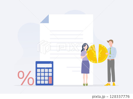 コイン・資金・利益・費用を半分ずつ分け合うビジネスマンとビジネスウーマン