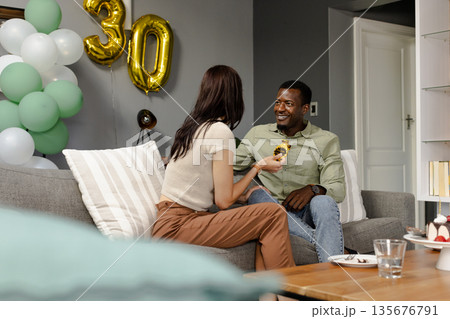 Celebrating 30th birthday, couple having cake and chatting on cozy living room sofa