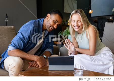 Celebrating together, friends sharing joyful moments with smartphone in living room