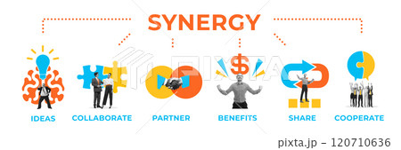 Set of business visuals showcasing ideas, partnership, benefits, and cooperation, highlighting concept of synergy in business success. Conceptual design.