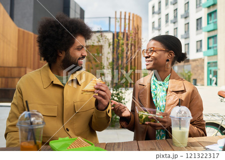 Two friends sitting at an outdoor cafe enjoying lunch together. They are engaged in conversation and sharing food, creating an atmosphere of camaraderie and relaxation