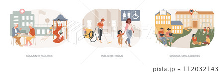 Public places isolated concept vector illustration set. Community facilities, public restrooms, sociocultural infrastructure, cleaning and hygiene, health centre, school building vector concept.