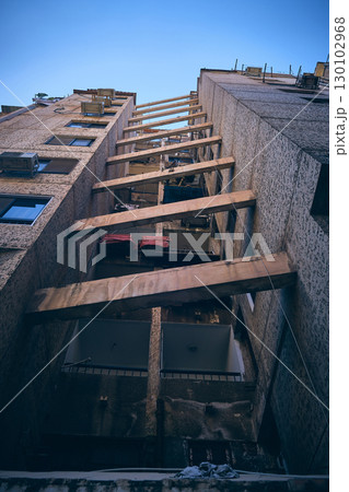 Urban alley with high-rise buildings and connecting wooden beams