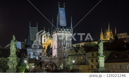 The night View on Prague Lesser Town with St. Nicholas' Cathedral and Bridge Tower timelapse, Czech Republic