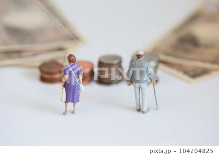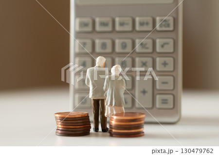 計算機の前に立つミニチュアの老夫婦と硬貨 年金 老後のお金イメージ