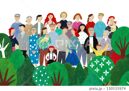 正面を向き笑顔で並ぶ手描き色鉛筆表現の多世代の人々