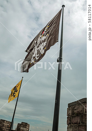 Flags and cloudy sky on the Gravensteen Castle