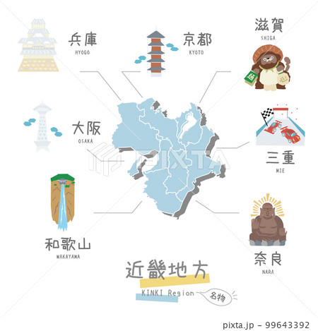 日本の近畿地方の名物観光とマップ、アイコンのセット