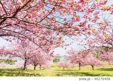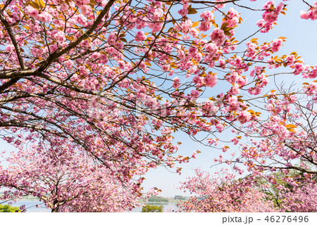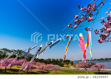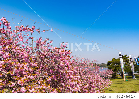 宮城長沼の兵粮山公園の鯉のぼりと満開の八重桜