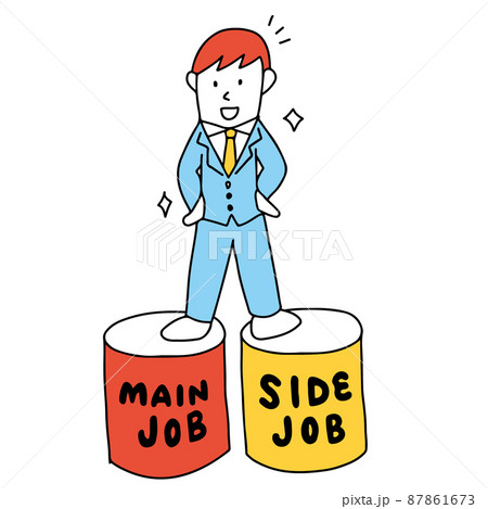 副業・複業・パラレルワーク・パラレルキャリア・兼業 二つの仕事を股にかけるビジネスマンのイラスト