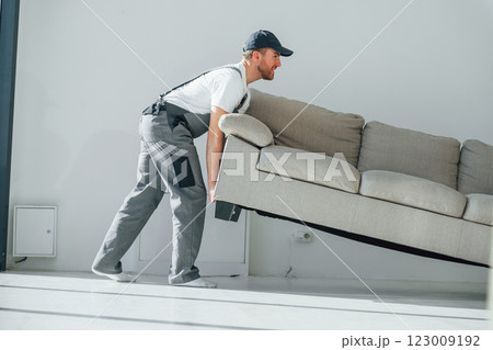 Manipulating the industry machine. Factory male worker in uniform is indoors