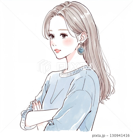 水彩風・腕を組んで悩む女性の手描きイラスト素材