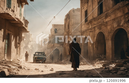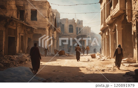 Refugees and displaced by war or a natural disaster walking through the streets of a destroyed city. Ruined demolition town. A city devastated by war and bombing. Middle east crisis