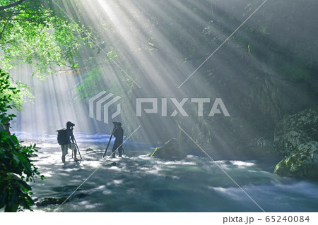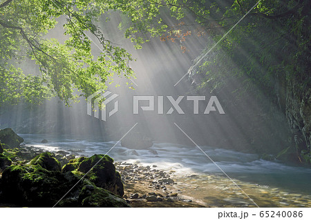 朝日が差し込む新緑と苔に包まれた円原川の幻想的な渓流風景