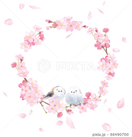 桜と小鳥(エナガ)の水彩イラストで構成した円形装飾フレーム。花びらの背景。(ベクター)