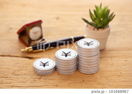 テーブルに積み上げられたお金(円)