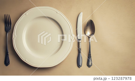 Cutlery, fork, knife, spoon and empty plate on a colored background. AI Generated