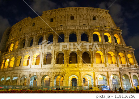 南欧イタリア共和国ラツィオ州 世界遺産ローマ歴史地区の円形闘技場コロッセオ遺跡の夜景