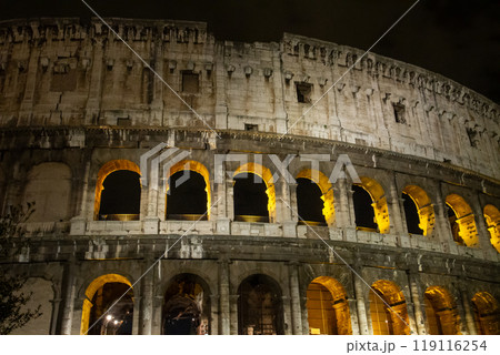 南欧イタリア共和国ラツィオ州 世界遺産ローマ歴史地区の円形闘技場コロッセオ遺跡の夜景