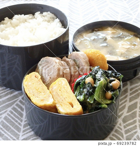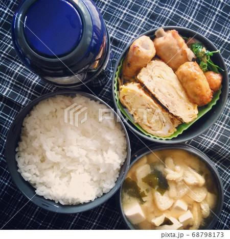 手作り弁当のおかずと白いごはんとみそ汁と
