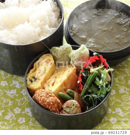 あたたかいとろろこんぶの汁物が付いた手作り弁当
