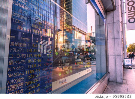 日本の東京都市景観 円安…夕日を映す東京駅前八重洲口の株価ボード。日が沈むのが早くなった…=10月