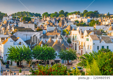 Scenic panoramic view of Alberobello and trulli buildings, Apulia, Italy