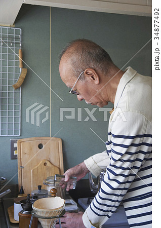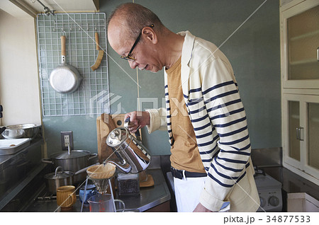 コーヒーを淹れるシニア男性