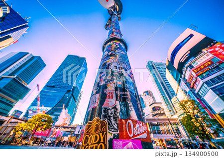 日本の東京都市景観元日。この柱はシールは健在。インバウンドが続く渋谷。ほとんどが外国人観光客