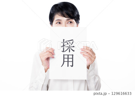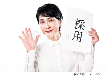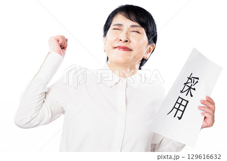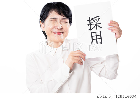 採用と書かれた紙を持ち嬉しそうな表情のシニア女性