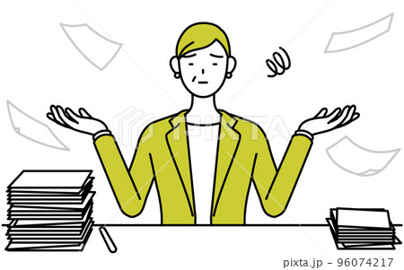 片付かない業務にうんざりするスーツ姿のシニア女性、女性管理職・キャリアウーマンのシンプルな線画イラス