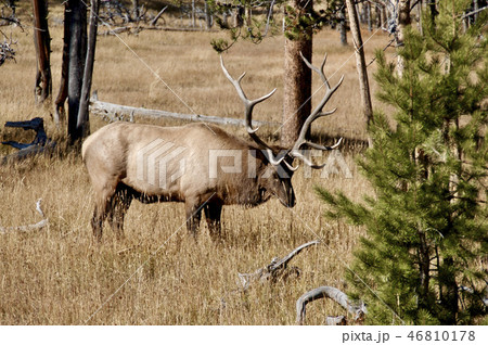 イエローストーン国立公園の林に中にたたずむアメリカアカシカ