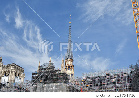 パリ、フランス。火災後、再び姿を現したノートルダム大聖堂の尖塔。2024年4月14日撮影。