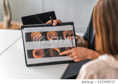 内視鏡検査で検査画像を見ながら女性患者と話をする男性医師
