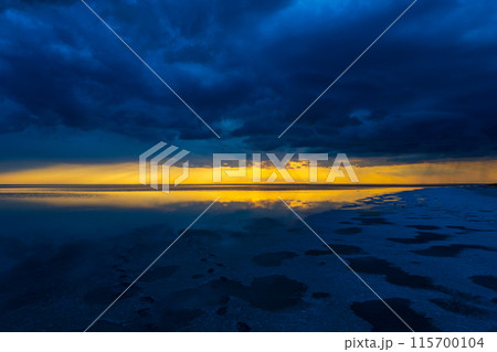 Dramatic sunset over calm sea with dark storm clouds