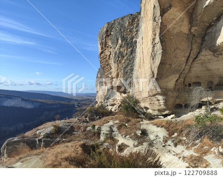 Expansive view of ancient caves carved into cliffs in a dramatic mountainous landscape under a clear blue sky
