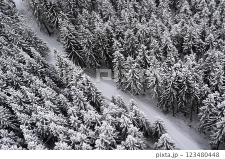Aerial top view winter forest with fresh snow and white trees in Dolni Morava