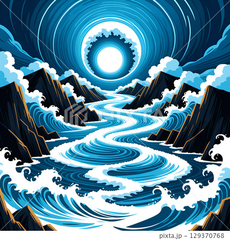 Dramatic river flows through rugged mountains towards a swirling vortex under a bright, ethereal sky.