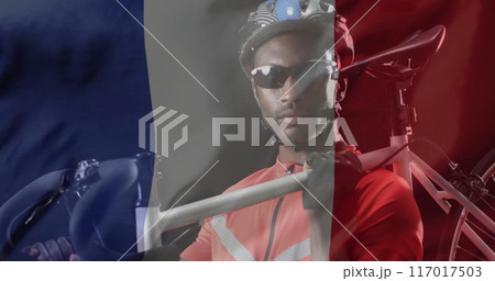 Image of flag of usa over happy diverse men carrying women piggyback on beach in summer