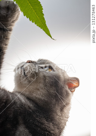 marbled silver Scottish Fold cat curiously stretches its paw to touch a green leaf illuminated by soft natural light. The cat appears playful and inquisitive in its environment.