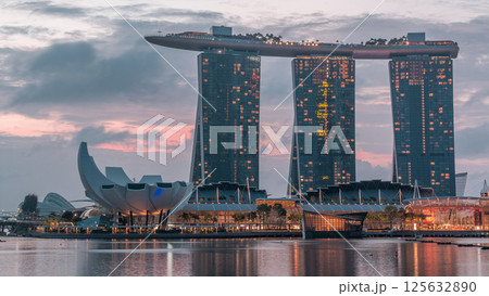 Marina Bay Sands Hotel dominates the skyline at Marina Bay in Singapore night to day timelapse.