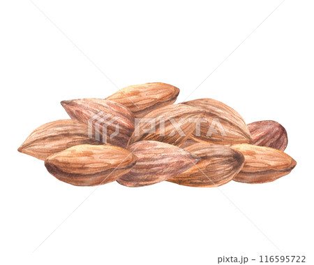 Heap of nuts. Pile of peeled almond kernel. Watercolor hand painted food illustration. Healthy vegan stone fruit harvest. Clipart on isolated background. Organic nature snack, cosmetic, product label