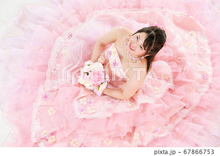 ウエディングドレス姿の可愛い新婦様、白バック背景