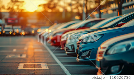 混雑した自動車ディーラーの駐車場に沈む夕日の輝き、自動車ビジネスのイメージ。AI画像