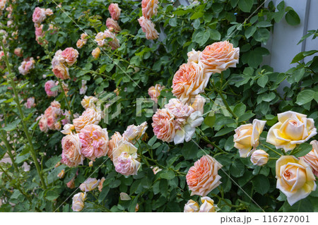 ガーデンのフェンスで咲く美しいオレンジ色のバラの花